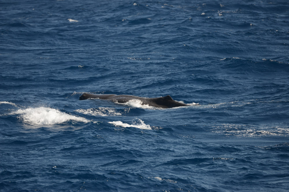 A subadult male sperm whale surfaces, the left-angled blow being characteristic of sperm whales.
