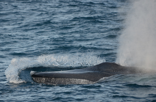 On deck we began the same procedure as yesterday, the tagging and biopsy gear was positioned on the bow and I stayed on the Portuguese bridge to get photo-id shots, planning to move forward with any close passes. The whale took three breaths and then was down for 7 minutes. The next blow seen was 1 nm further to the SW, we followed but when we saw another blow 2 nm out, we were reluctant to go any further in that direction, as this was towards the eye of MOB (‘Mother of the Beast’) of whom we have carefully been avoiding. As the whale swam perpendicular across the bow, I was able to get a left lateral body photo-id of this animal and with the surfacing style and head size and shape, we decided this was a Pygmy blue whale! This is indeed blue whale country! And yes, Sam was 100% right (!), asking about waking was totally academic as shown by my lunchtime sighting!