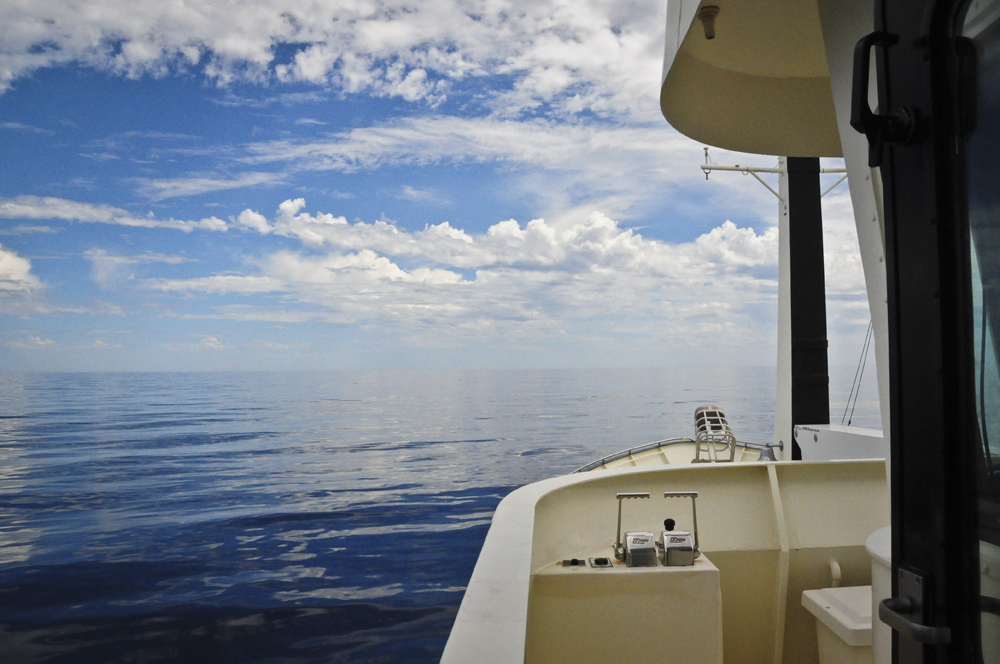 At 1130, we had 15 common dolphins bow-riding and leaping in the stern wake. Our second pod of close to 50 individuals encountered at 1530 had a small tightly knit swimming group composed of three calves and three mothers jostling in the bow-wash. Skipper is oh-so happy! Their bodies are so strong and athletic; it is great to see them at such close range. By 1600, our gorgeous weather has given way to SW of 15-20 knots and in fact, on the fly-bridge the wind has a cool edge making my eyes stream. Just as well we didn’t turn around!