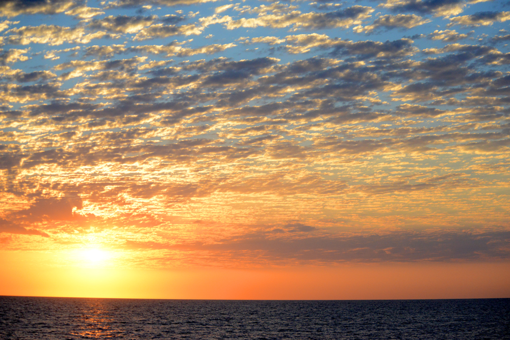 Cloudless for several days as the afternoon progresses, soft cumulus cloud appears, becoming more predominant and bringing a beautiful backdrop to the sunset. On deck as the sun dropped, cameras were poised to record the potential green flash… despite the clear horizon, a yellow rather than green flash occurred. It was “a Kodak moment”, if we can still refer to continuous clicks of camera shutters as this!