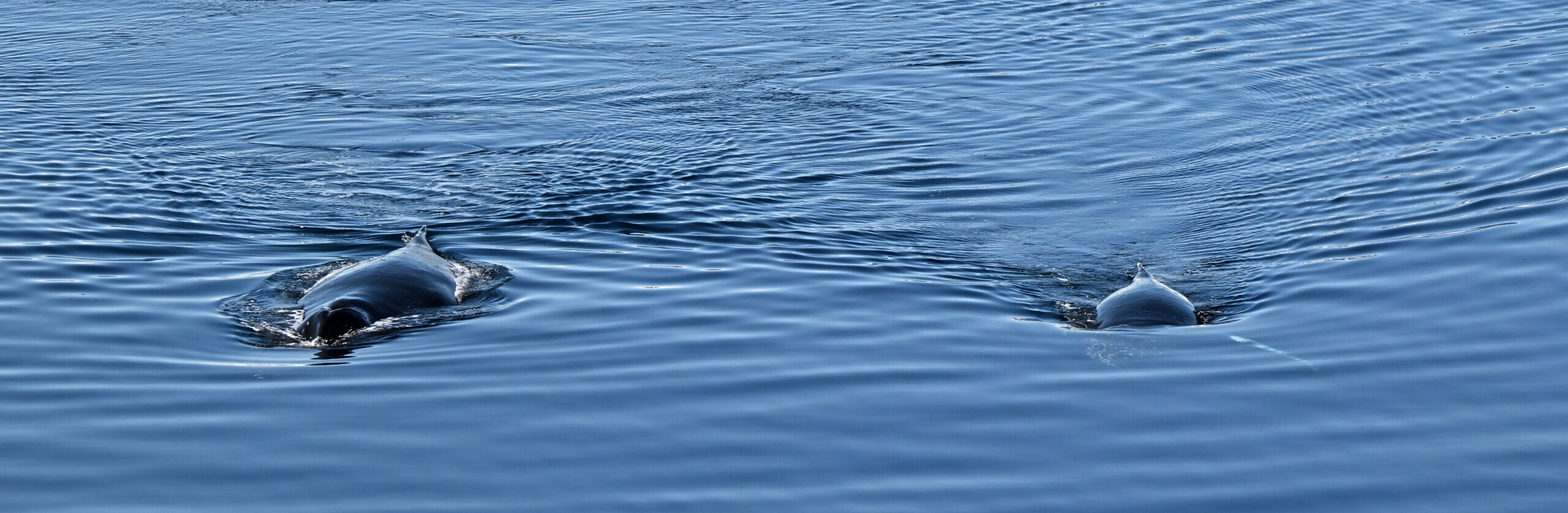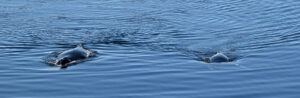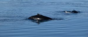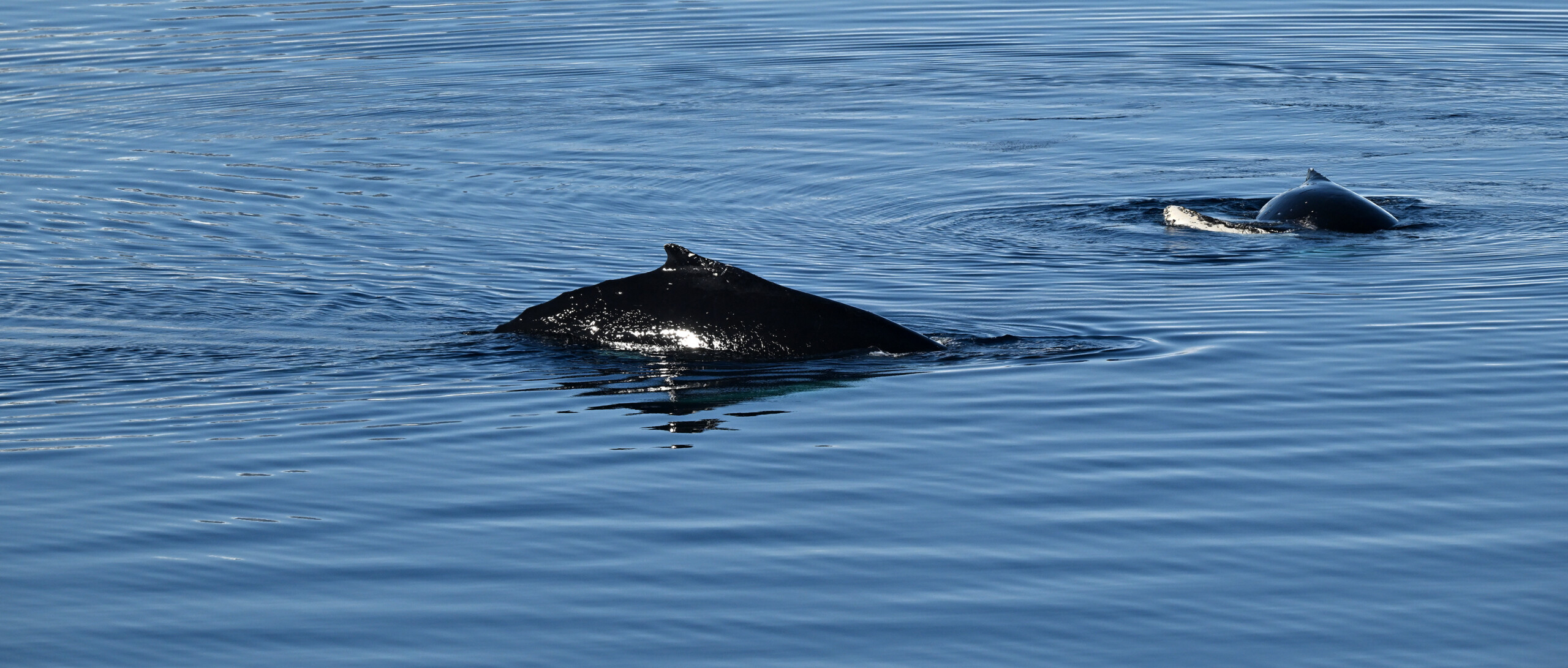 A pair of adult humpback whales migrates slowly in the glassy calm conditions. They are on the hunt for krill, swarms of krill to effectively fuel their energetic winter breeding period. Photo: Micheline Jenner.