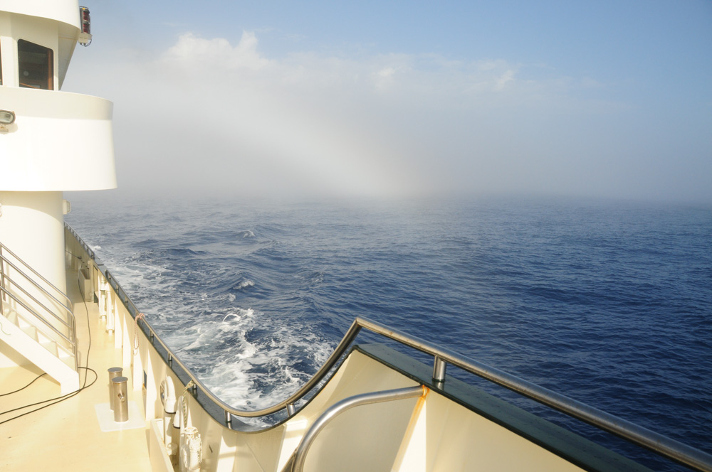 A white, ghostly haze had shrouded Whale Song, like the sea fog we experienced in the Antarctic two summers ago.   A few things were different in each situation, including our latitude and longitude, (although both experiences were in the Southern Ocean) but my bare feet on the steel deck, really told me I was not at the ice-edge again!
